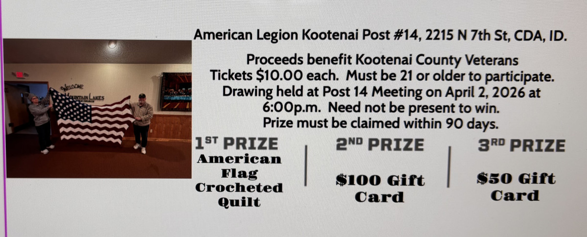 Stay tuned to see what kind of valuable items we'll be raffling off in 2026! If you have any questions on our raffles, sales or locations, please feel free to call the legion office at 208-699-6540 between 8:00 and 10:00 AM on Monday and Thursday or by email to idaholegion14@gmail.com